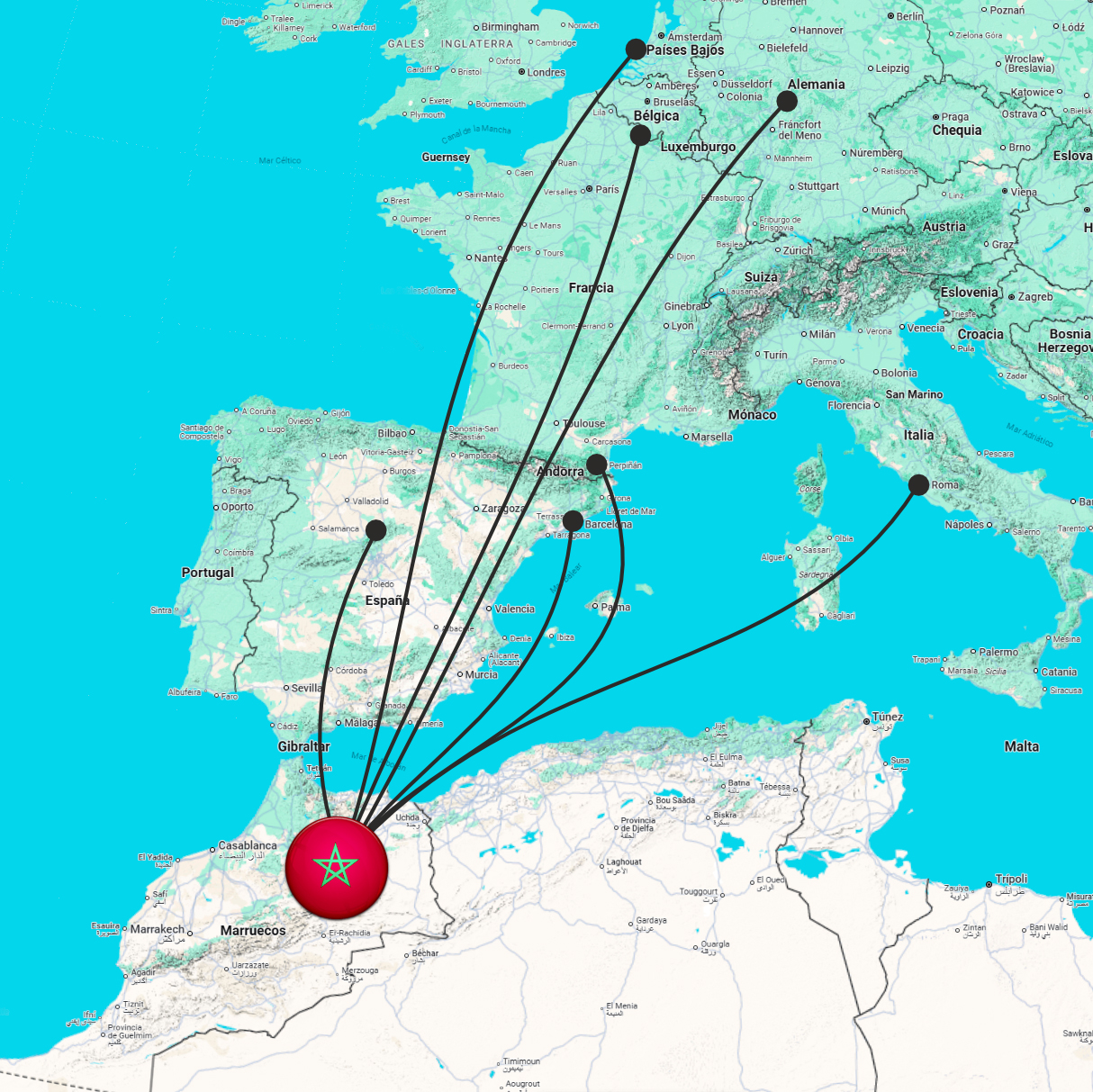 Exportamos para todo el mercado europeo, Barcelona, Madrid, Perpignan, Holanda, Alemania, Belgica, Italia entre otros, con una logistica controlada y con puntualidad en sus entregas, para asi ser distribuida.